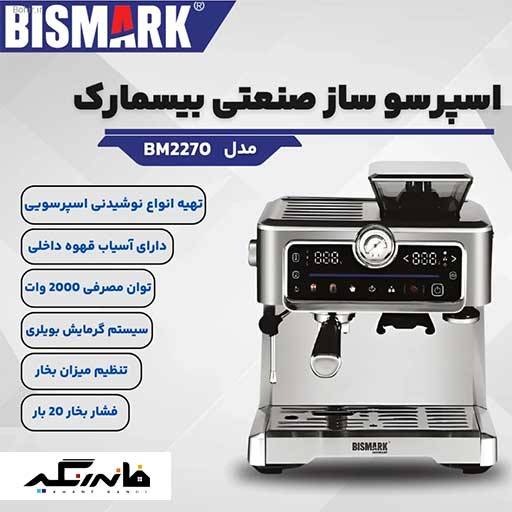 اسپرسو ساز صنعتی بیسمارک BM2270، اسپرسو سازی با قدرت،توان مصرفی 2000 وات و فشار بخار 20 که برای مکان هایی همچون کافه ها بسیار مناسب می باشد. اسپرسو ساز صنعتی بیسمارک BM2270 بدنه ای تمام استیل و مقاوم دارد که آن را نسبت به رقبای خود متمایز نموده است. اسپرسو ساز بیسمارک مدل BM2270 دو نازل قوی آسیاب داخلی دارد. صفحه نمایش لمسی دیجیتال اسپرسو ساز بیسمارک امکاناتی همچون تنظیم دقیق غلظت و بخار قهوه را برای شما فراهم می کند. شما میتوانید با قابلیت استفاده از سیستم کاپوچینو ساز، پودر و دانه قهوه لذت نوشیدنی های متنوع را بچشید.